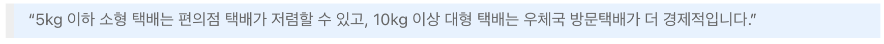 A. 10kg 이상 대형 물품은 우체국 방문택배가 더 저렴하고 편리합니다. 5kg 이하 소형 물품은 편의점 택배가 경제적입니다.